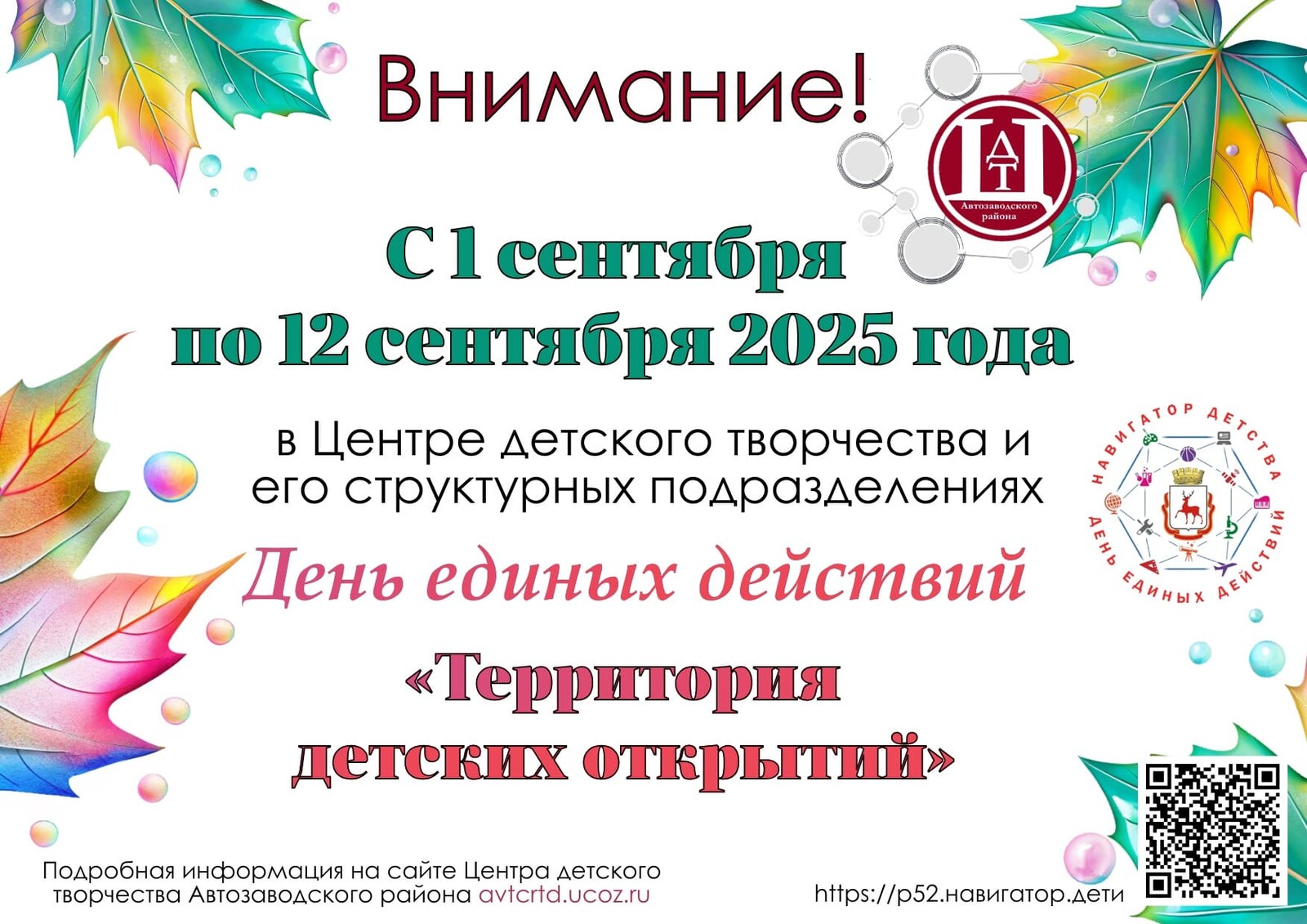 Дорогие родители и ребята! Приглашаем вас на наши традиционные Дни единых действий «Территория детских открытий»!